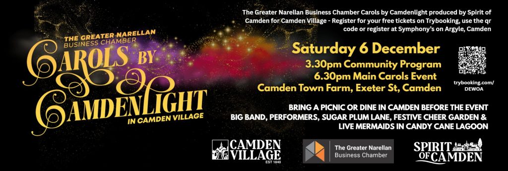 Join us on Saturday 6 December 2025 for The Greater Narellan Business Chamber’s Carols by Camdenlight produced by Spirit of Camden for Camden Village. Gates open at 3pm for the Community Program starting at 330pm. The main Carols Program to commence at 630pm.