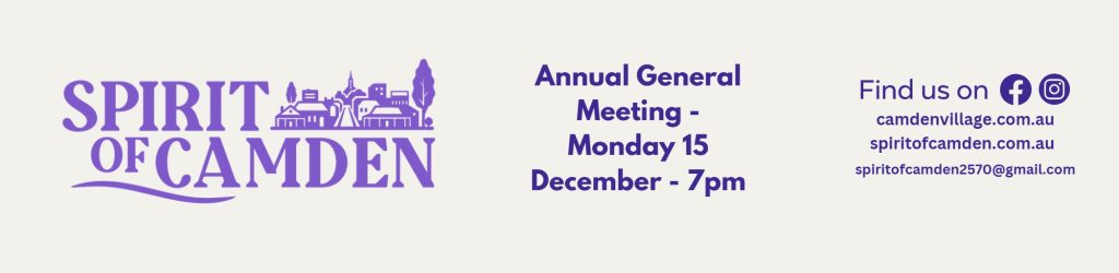 Spirit of Camden inc will be holding their AGM on Monday 15 December 2025 at 7pm. Location to be confirmed (Camden based). Please let us know if you are coming and if you would be seeking nomination for a position on the board. Nominations close midnight Sunday 7th December 2025.